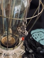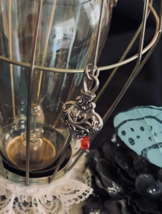 Perched beneath an old-world Edison bulb in a gothic brass cage, Bella and Edward are frozen in eternal longing—sealed under crackled varnish like a vampire in denial. Filigree corners, black-lacquered carnations, a lace ruffle, and a butterfly add just the right touch of undead charm.