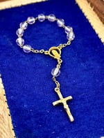 Carry a touch of devotion and beauty wherever you go with this delicate vintage mini rosary. Crafted with luminous pale pink glass beads and traditional yellow gold tone links, it features a finely detailed crucifix and a small centerpiece with the Virgin Mary. Perfectly sized to slip into a pocket, keep in a purse, or wear as a prayer bracelet, it’s both a spiritual keepsake and a charming vintage collectible.